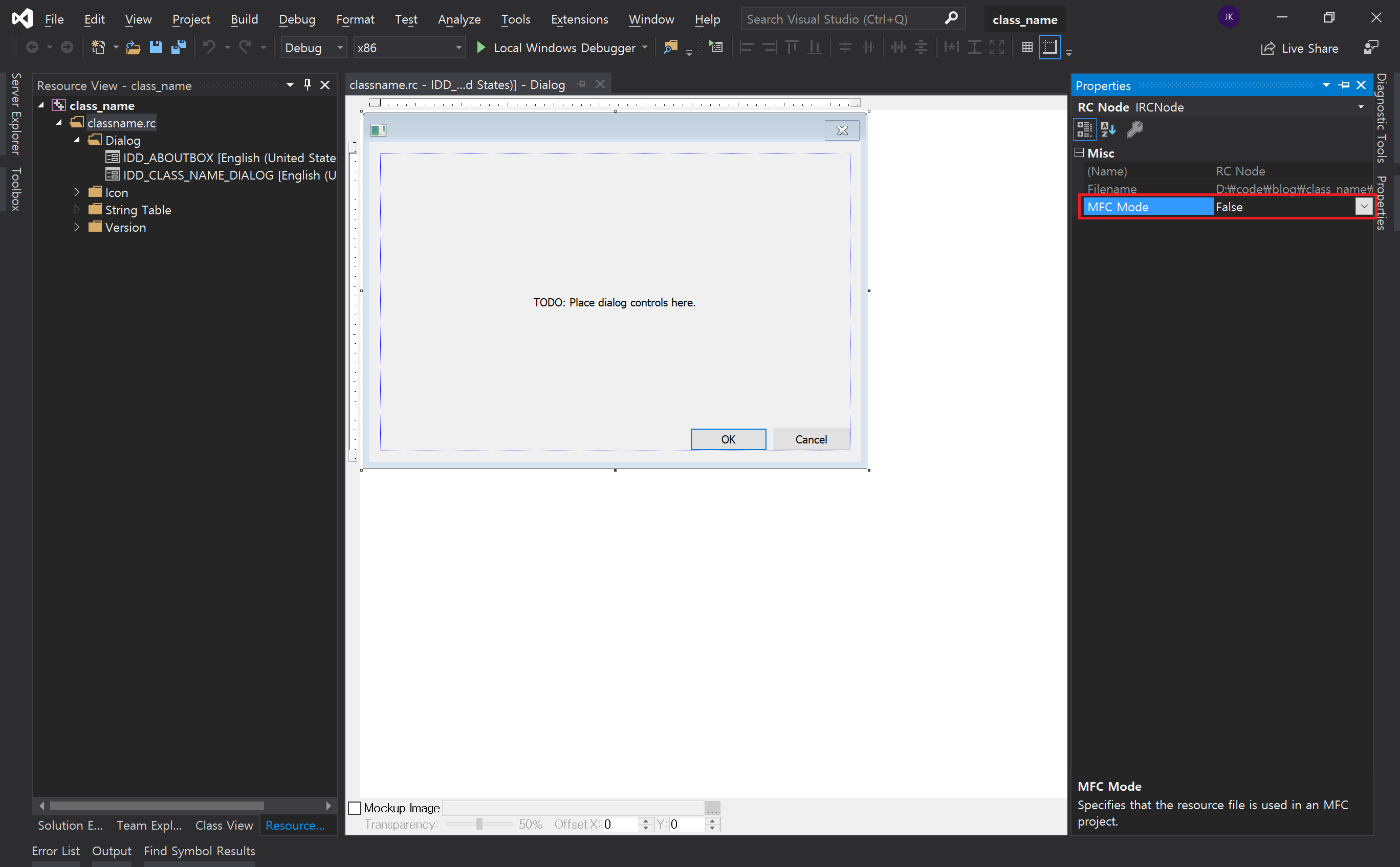 기본적으로 project.rc 파일이 생성되고, 그 안에 Dialog의 Properties를 보게 되면 Class Name이라는 항목이 존재합니다.