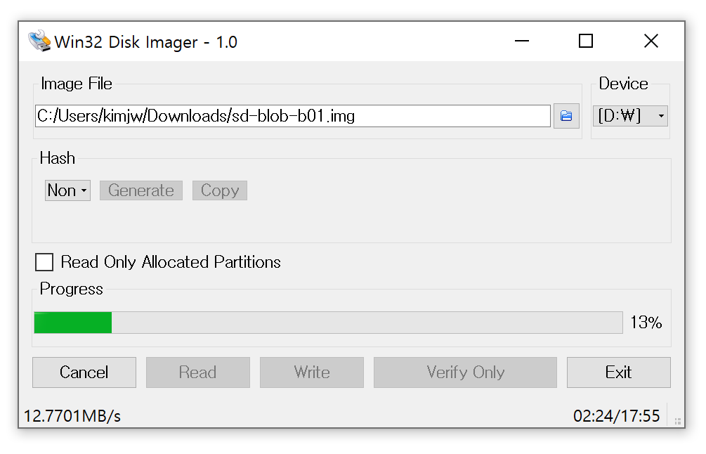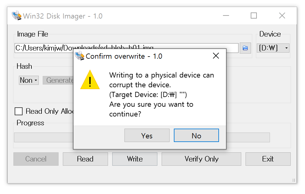 설치가 완료되었으면 아까 다운로드 후 압축 해제한 sd-blob-b01.img 파일을 선택한 후 Write 하도록 합니다.
