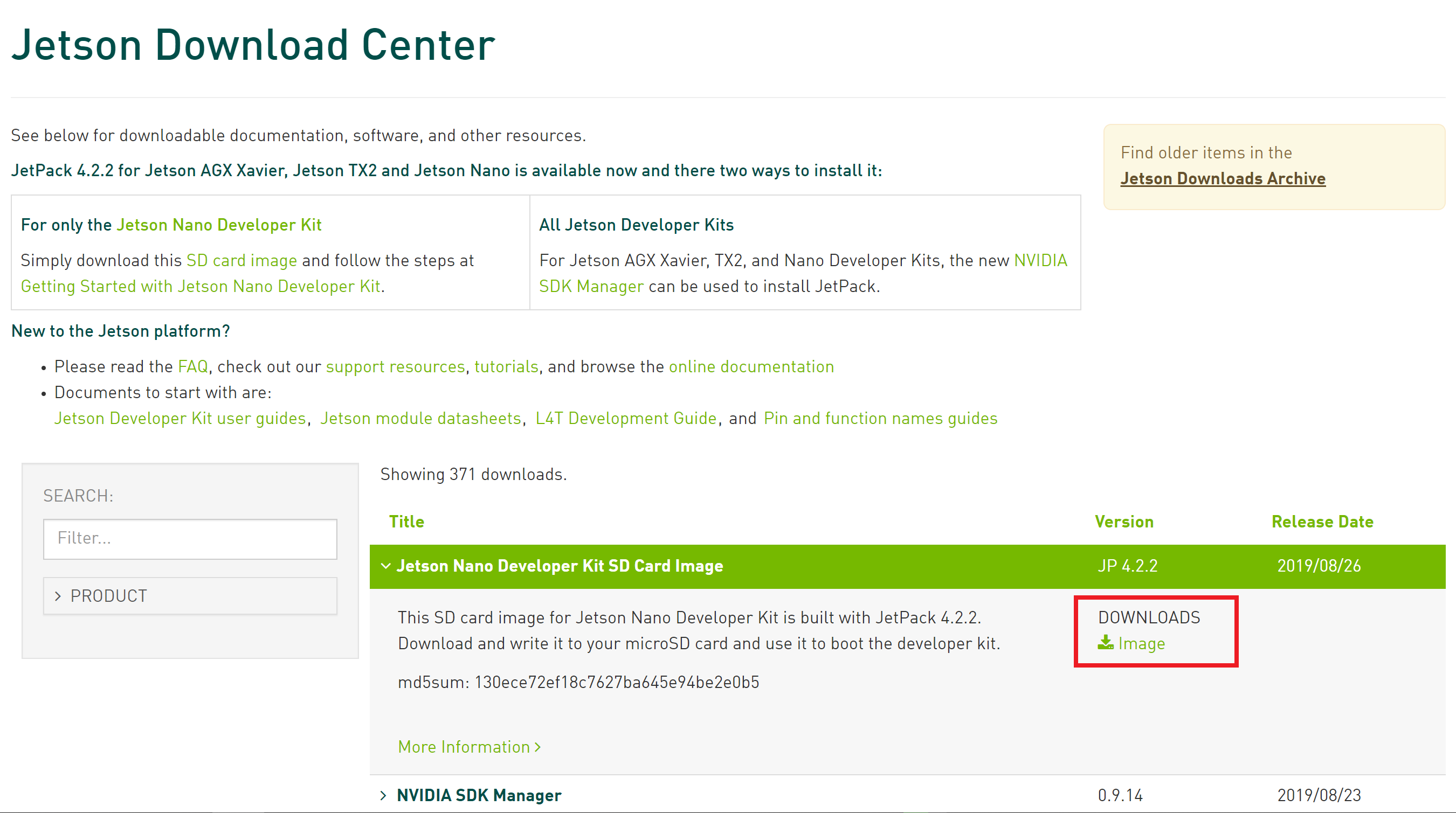 가장 먼저 아래 사이트에서 Jetson Nano Developer Kit SD Card Image를 다운로드합니다.