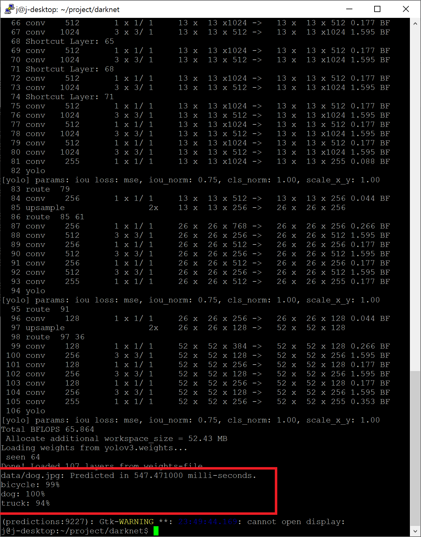 ./darknet detect cfg/yolov3.cfg yolov3.weights data/dog.jpg