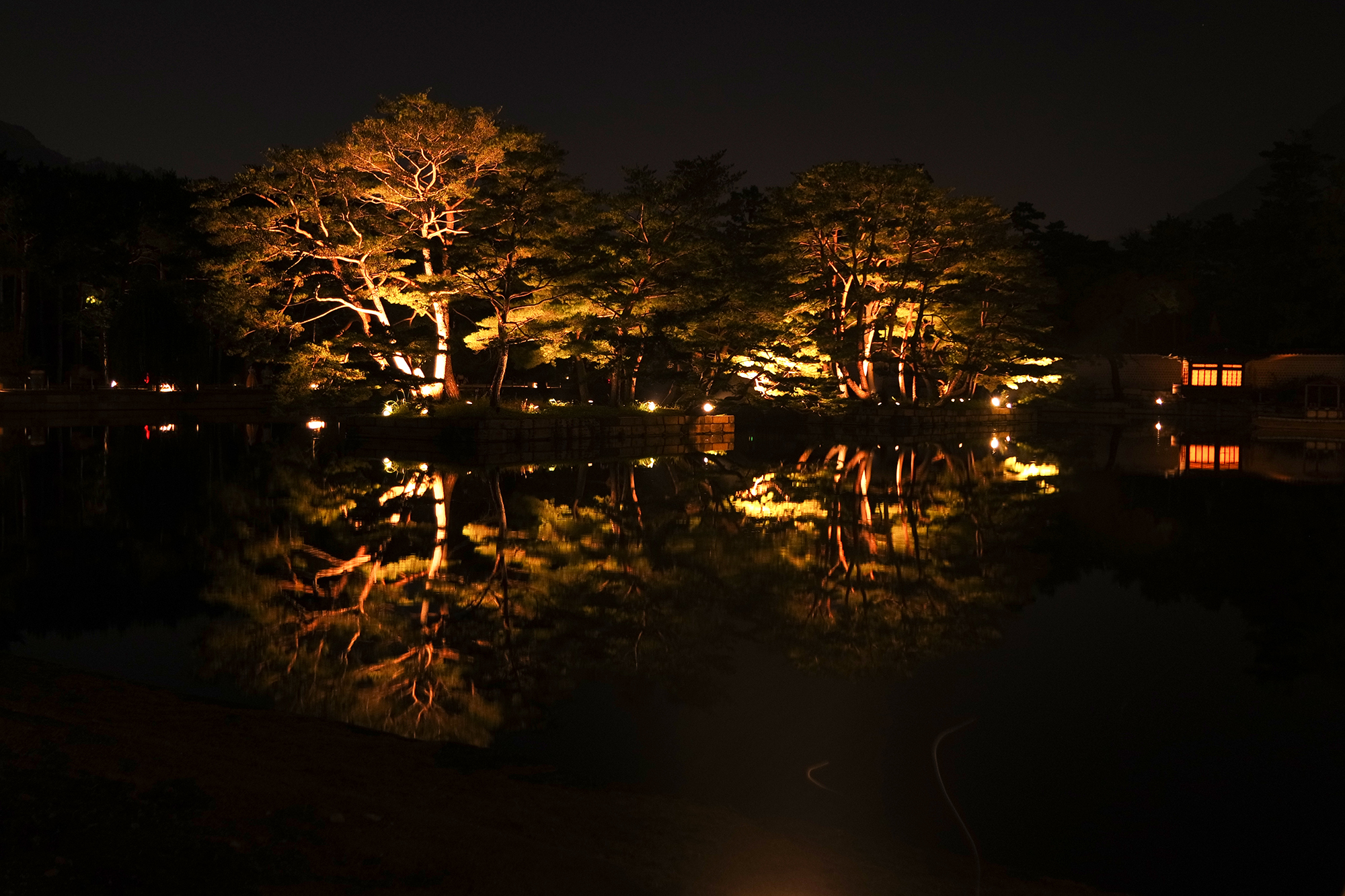 조명 불빛이 아른거리는 경회루가 연못에 반영되는 모습은 낮이나 저녁이나 사람들을 홀리기에 충분해 보입니다.