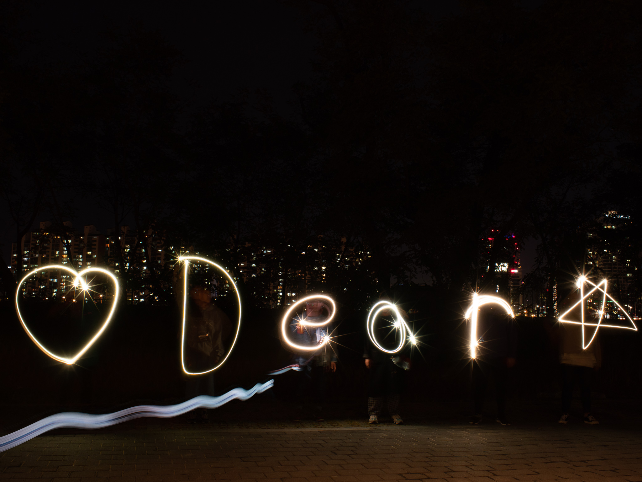 카메라 장노출 세팅을 해놓게 되면 불빛이 나오는 부분들이 합성되게 되어 단순히 핸드폰 라이트를 이용해서 다음과 같은 사진들을 찍을 수 있게 됩니다.