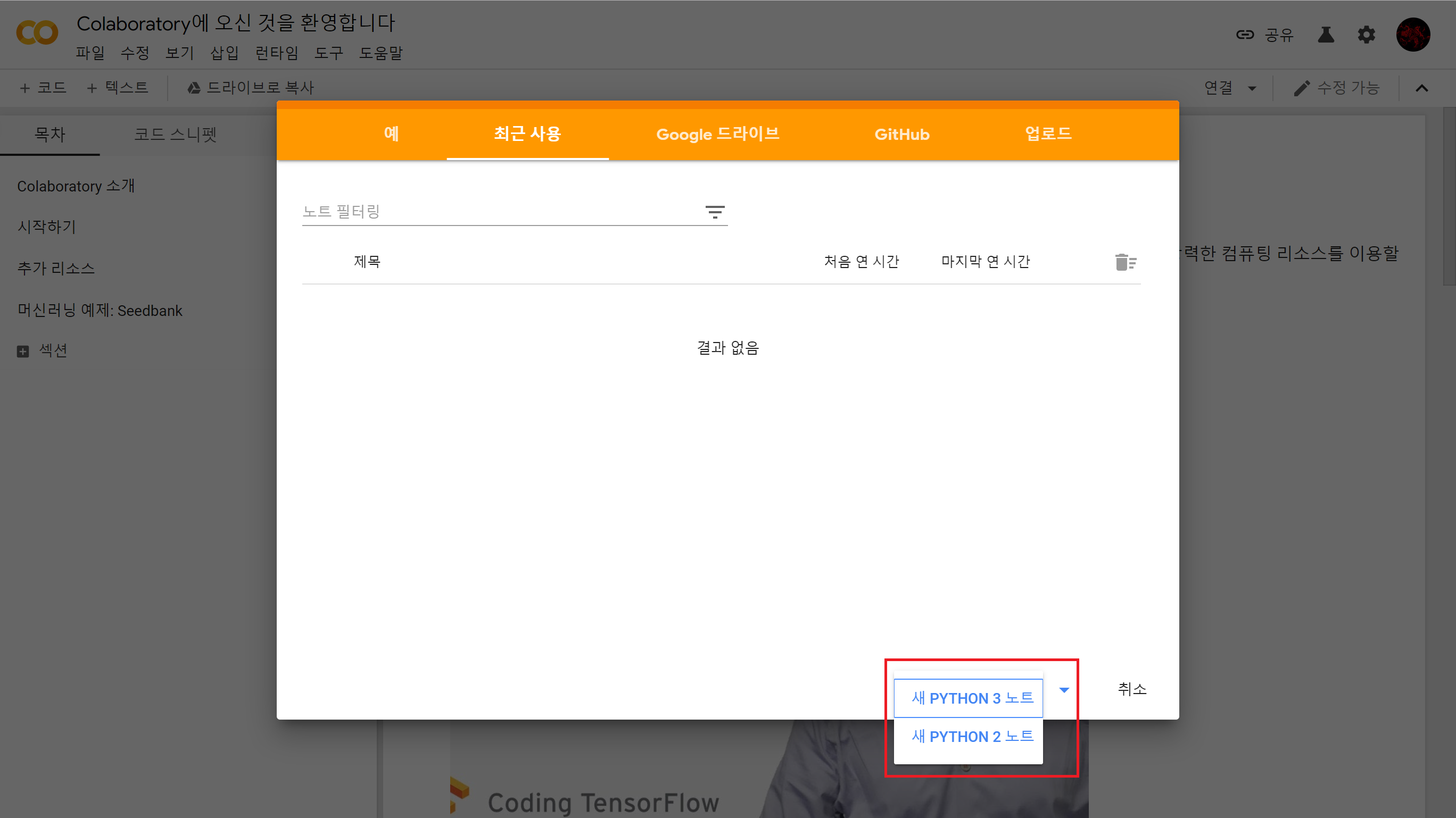 Google Colaboratory 사이트에 접속하게 되면 아래와 같이 문서를 생성할 수 있는 화면이 나타나게 됩니다.