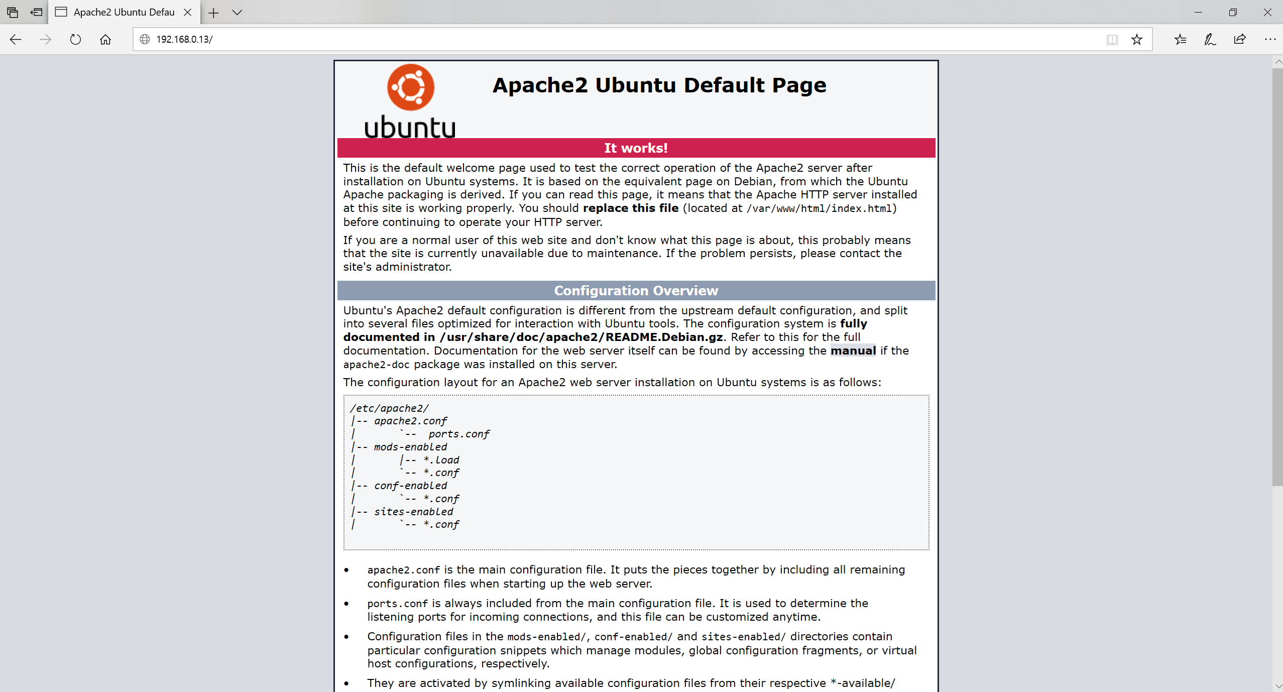 초간단 서버 설치가 완료되었습니다. 단순히 패키지 설치만으로 웹 서버가 열린다는 건 참으로 멋진 일입니다. 테스트를 위해 원격지 피씨에서 192.168.0.13 (ifconfig) 명령어를 이용하여 확인 후 접속을 시도해봅니다. 아래와 같이 Apache2 Ubuntu Default Page가 열린다면 정상적으로 설치가 완료된 것입니다. 물론 공유기를 통해 동일 네트워크에 있어야 하며, 만약 외부에서 접속이 가능하게 하고 싶으면 공유기에서 추가로 설정을 해야 합니다.