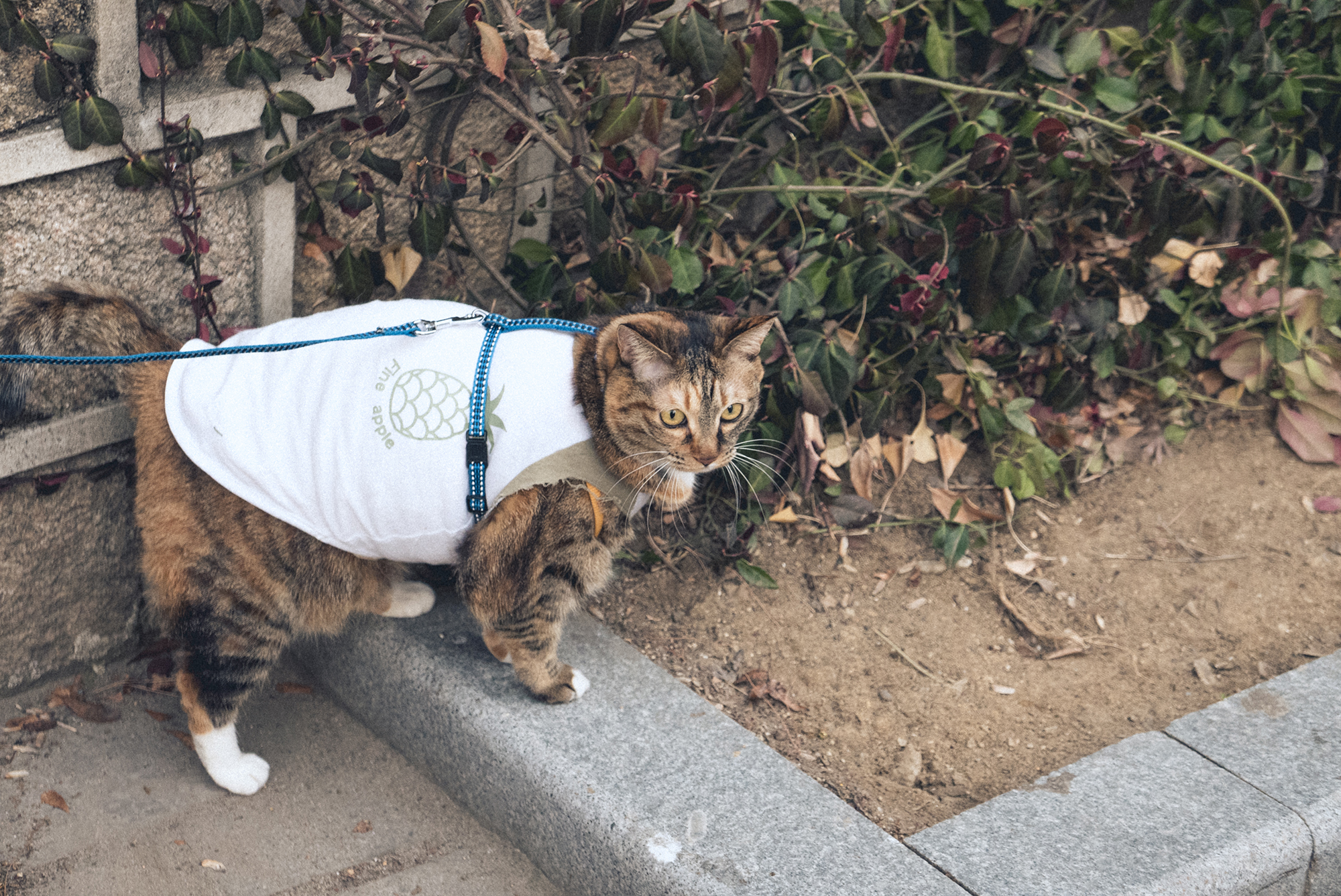 목줄을 메고 유유히 걸어서 산책 중인데, 인터넷에서 보기로는... 고양이는 산책하는 동물이 아니다 보니 좋지 않다고 본 것 같은데 사람을 무서워하지 않고 잘 걸어 다니고 있는 모양이었습니다.