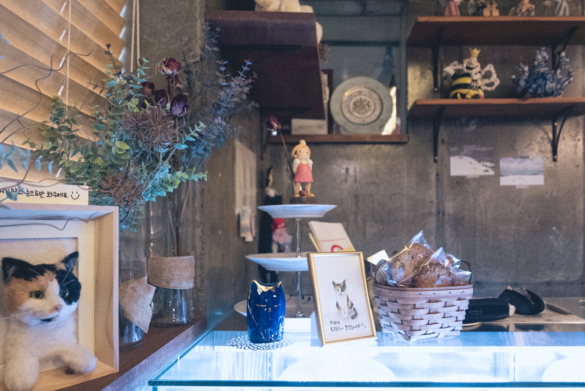 여기저기 고양이 관련된 것들이 아주 많아요~ 그보다 2층의 노을은 정말 멋집니다. 이 날따라 구름도 가득하고 햇살도 강렬하여 노을이 이렇게 멋질 수 있나 싶더라고요!! 아직 2층 테라스가 조금 춥긴 하지만 사진 찍을 정도는 되니 얼른 찍고 실내로 도망가면 됩니다.