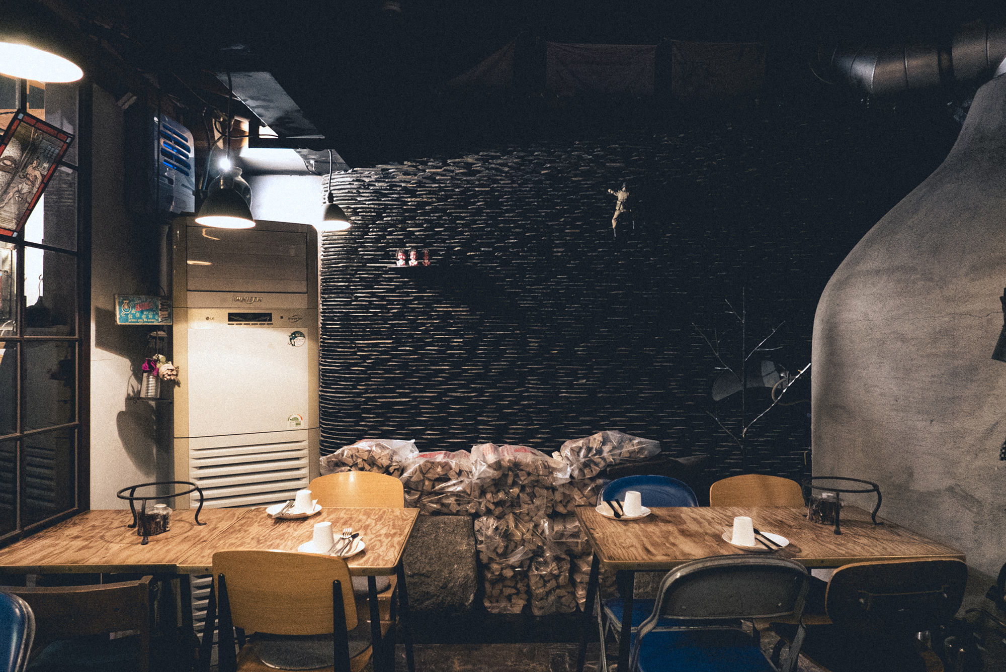 실내로 들어서자 불타오르고있는 커다란 화덕이 보였고 그 옆에는 장작들이 쌓여있는 모습입니다. 내부 외부 인테리어는 삼청동답게 한옥으로 되어있었는데 화덕과도 너무 잘 어울리는 모습이었어요.