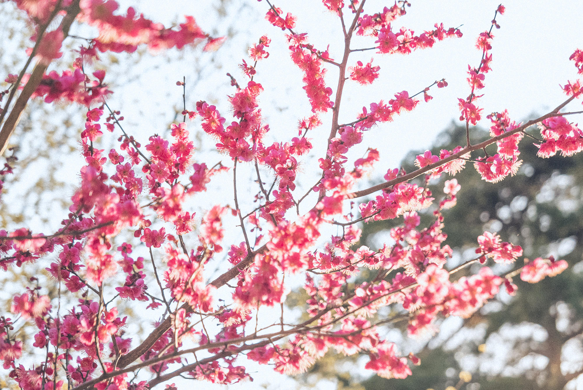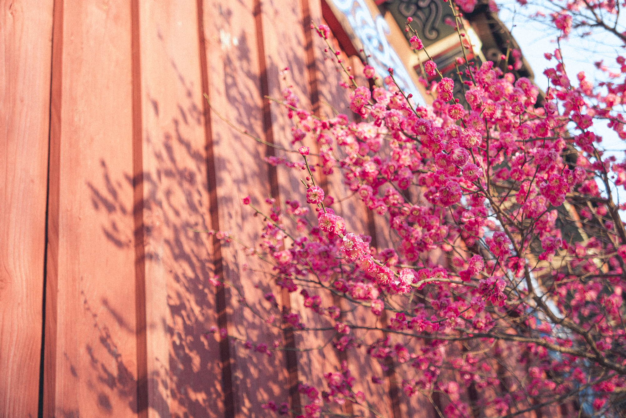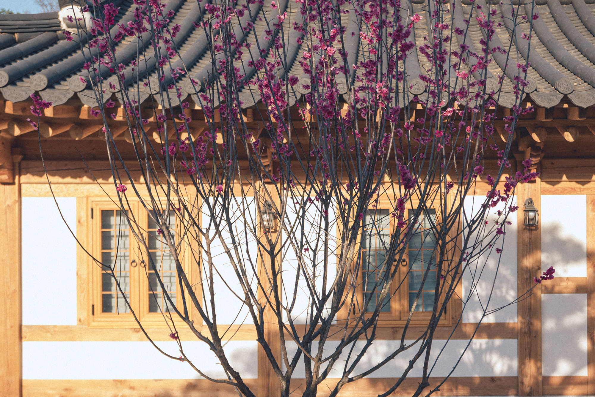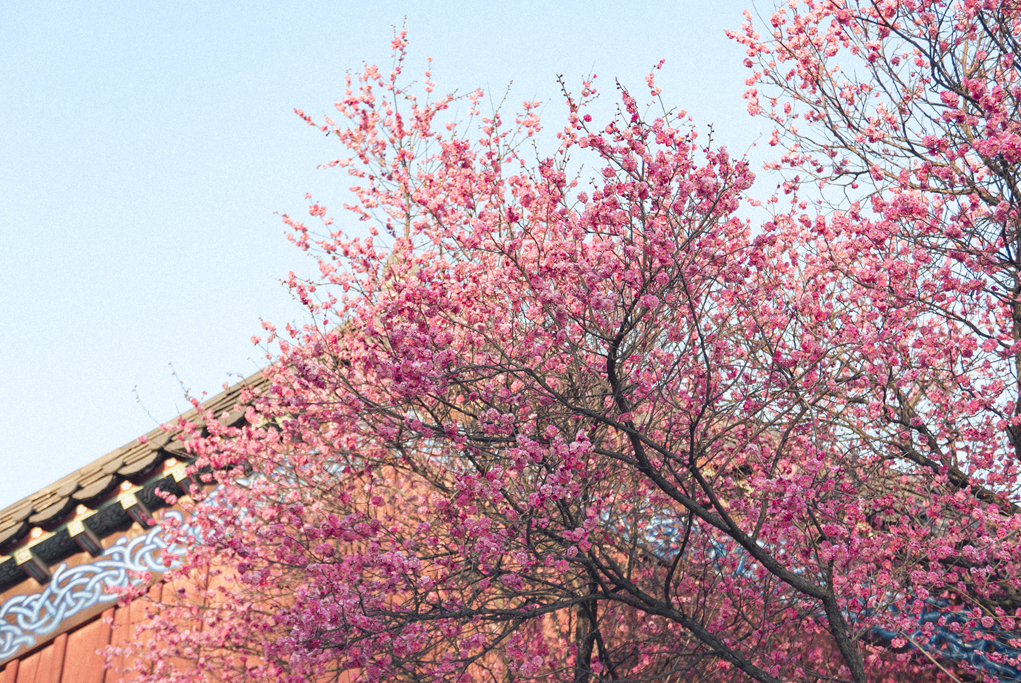 시간이 지나면 빛을 따라 위치를 이동하면서 다양한 홍매화를 찍을 수 있어요. 한 포인트 정도 홍매화 나무가 있는데, 각각 다른 위치에 있어서 주변에 아무것도 없는 홍매화 나무, 산수유나무와 어우러져 노란색 빨간색이 나오는 곳, 절 옆에 붙어있어 다양한 분위기를 연출할 수 있는 나무 등 여러 가지 포인트들을 돌아다니면서 찍다 보면 해는 금방 저버리게 됩니다.