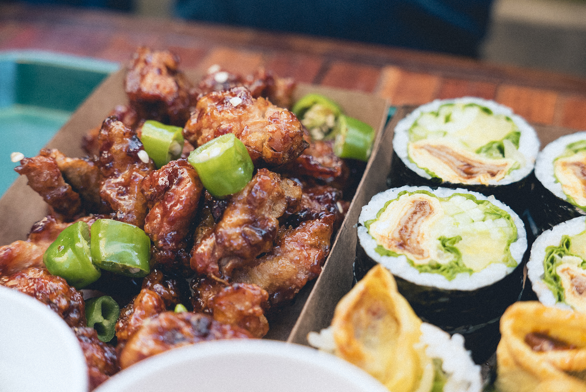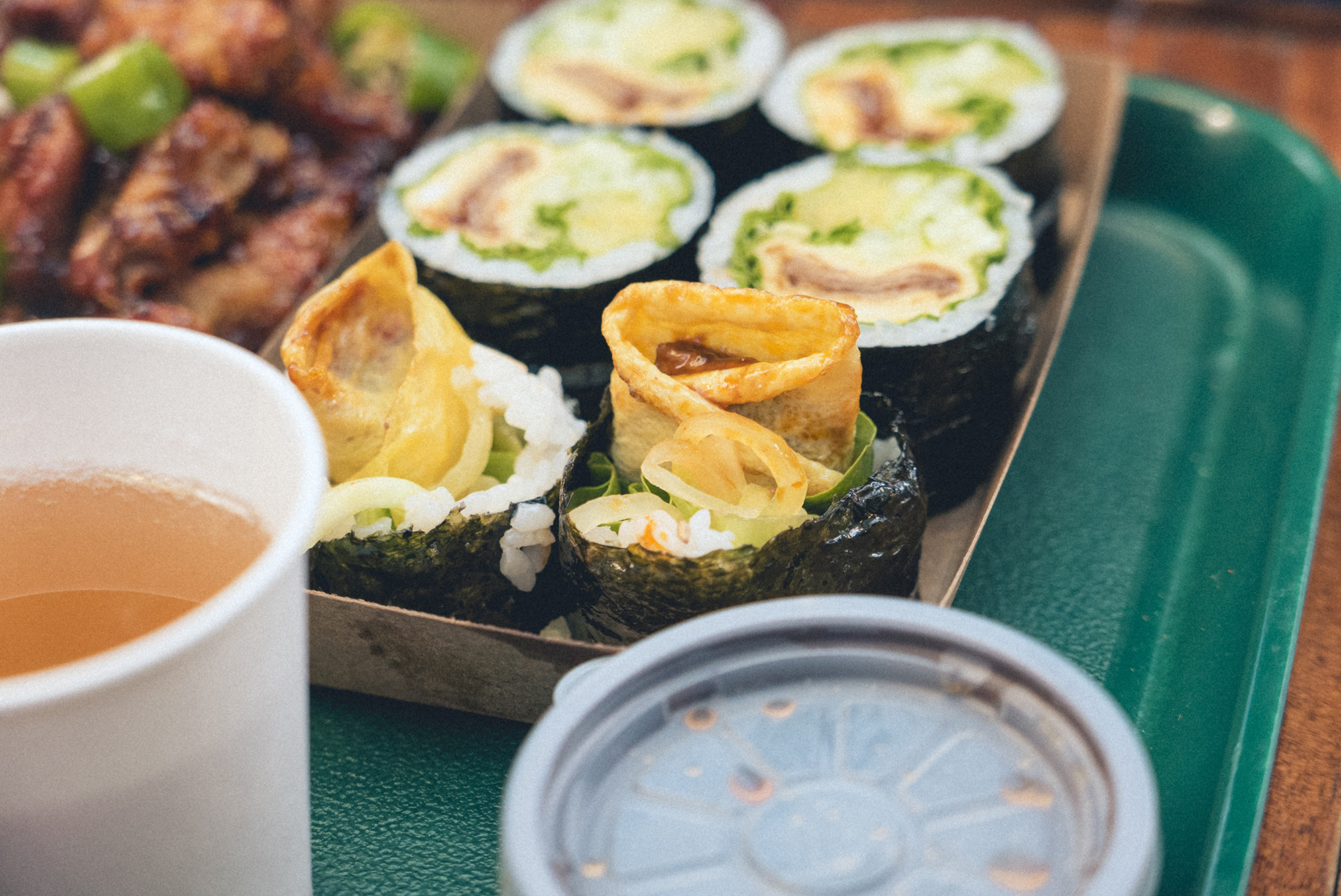 기다리다 보니 벨소리로 주문한 음식이 나왔음을 알려주었습니다. 따뜻한 물과 시원한 물, 그리고 주문했던 고추냉이 김밥과 닭강정이 나왔네요. 양은 가격 대비 아쉽지만! 원래부터 좋아하던 맛들의 조합이라서 맛은 정말 좋았습니다. 고추냉이 김밥을 고추냉이 간장 소스에 찍어먹는 건 꼭 고추를 고추장에 찍어 먹는 것 같은 느낌이지만 제가 평소에 좋아하는 변태스러운 조합니다! 고추냉이의 톡 쏘는 맛과 김밥의 향긋함, 그리고 매콤한 어묵이 더해져서 누구나 맛있게 먹을 수 있는 그런 맛입니다. 고추냉이 김밥에는 깻잎이 아니라 로메인과 오크 잎이라는 샐러드 잎들이 들어가는 것도 새로운 점 중에 하나였습니다.