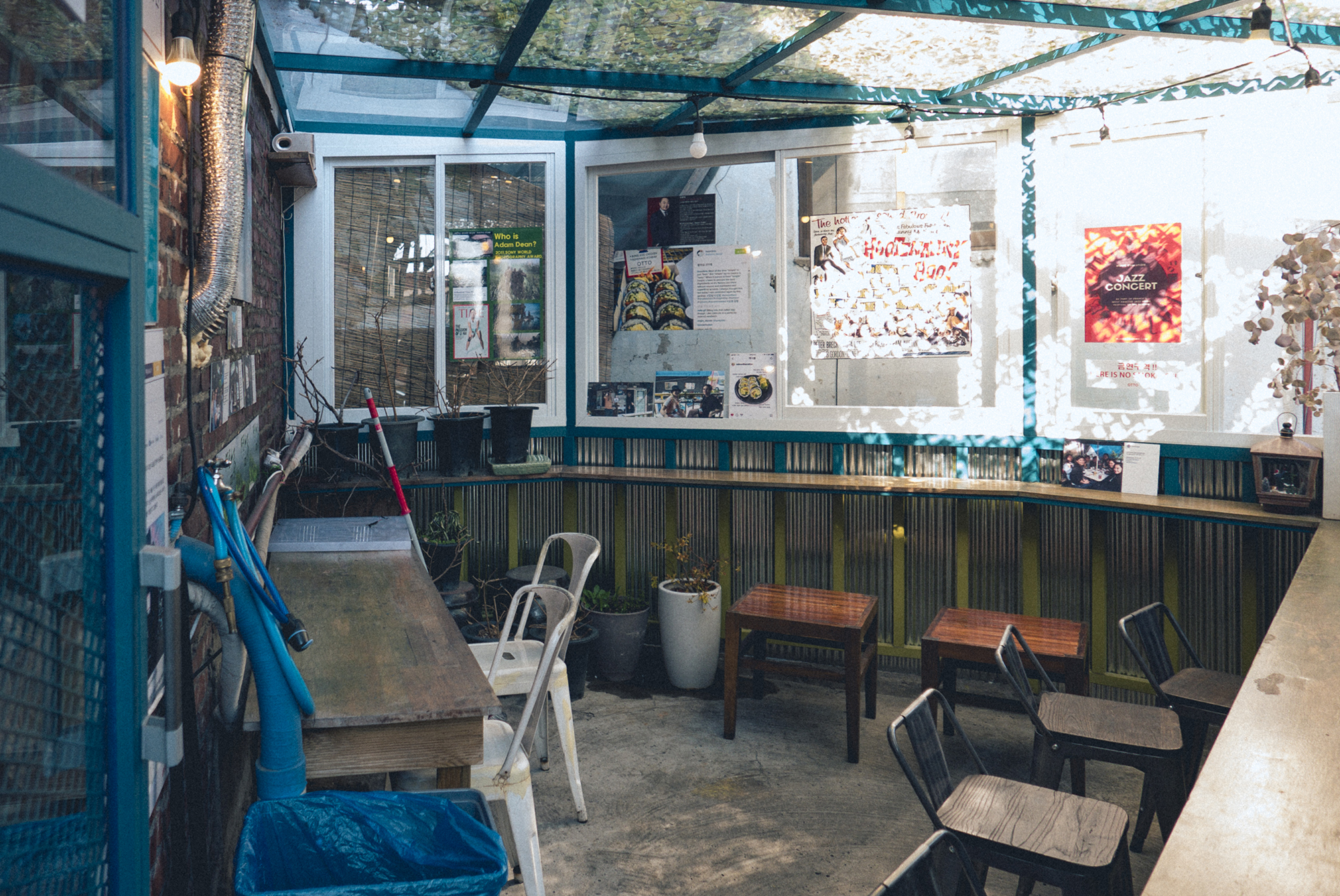 주문을 하고 우측으로 가게되면 밖에서는 잘 안 보이지만 앉아서 먹을 수 있는 공간이 마련되어있습니다. 입구에 들어설 때 다른 가게인가 의심을 하게 되었지만 벽면에 포스터들을 보고 OTTO의 공간임을 알 수 있었습니다. 작은 음악이 흘러나오고 있었고 빛이 워낙 좋아서 내려오는 햇볕에 그림자 마저도 반짝반짝거리고 있었습니다.