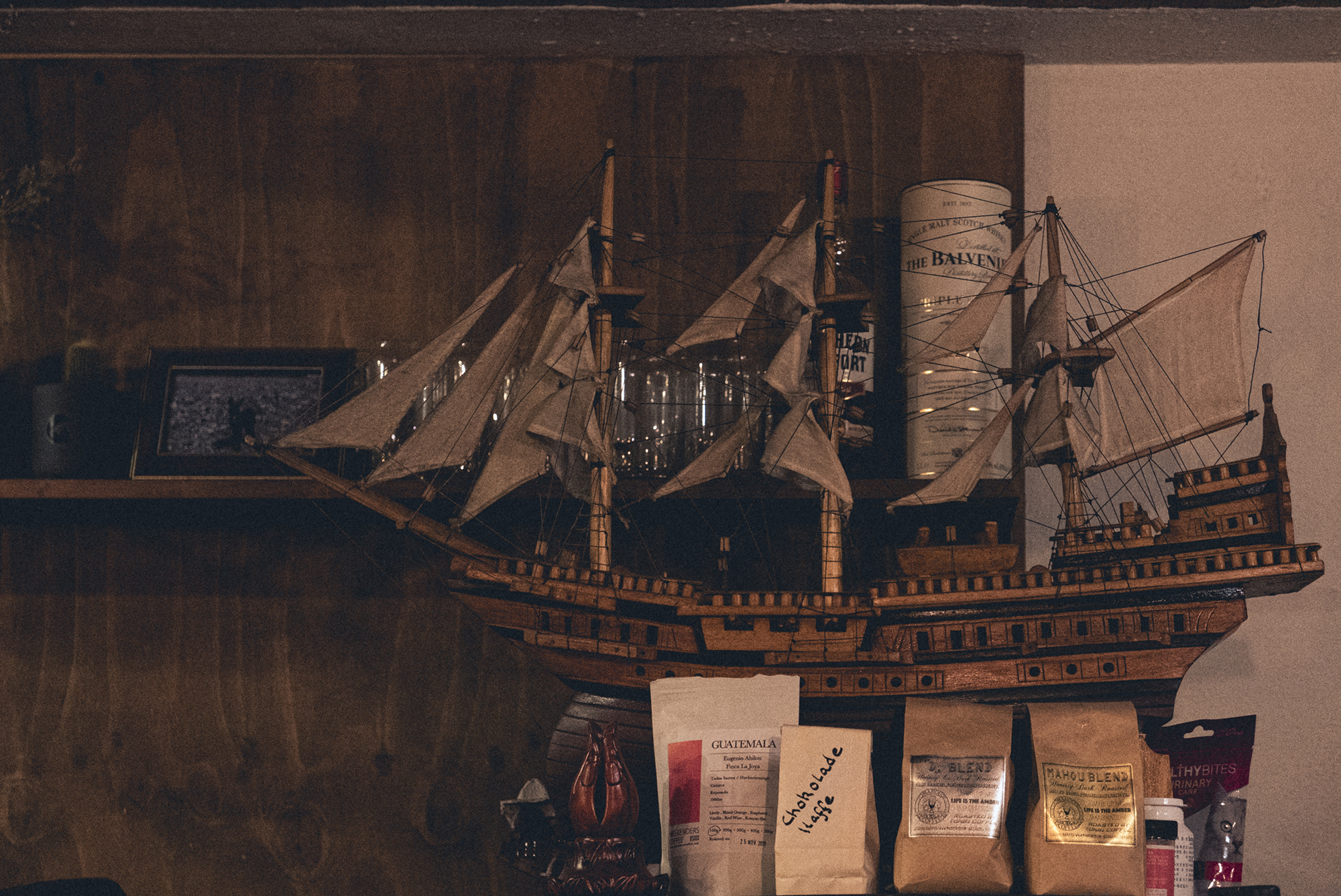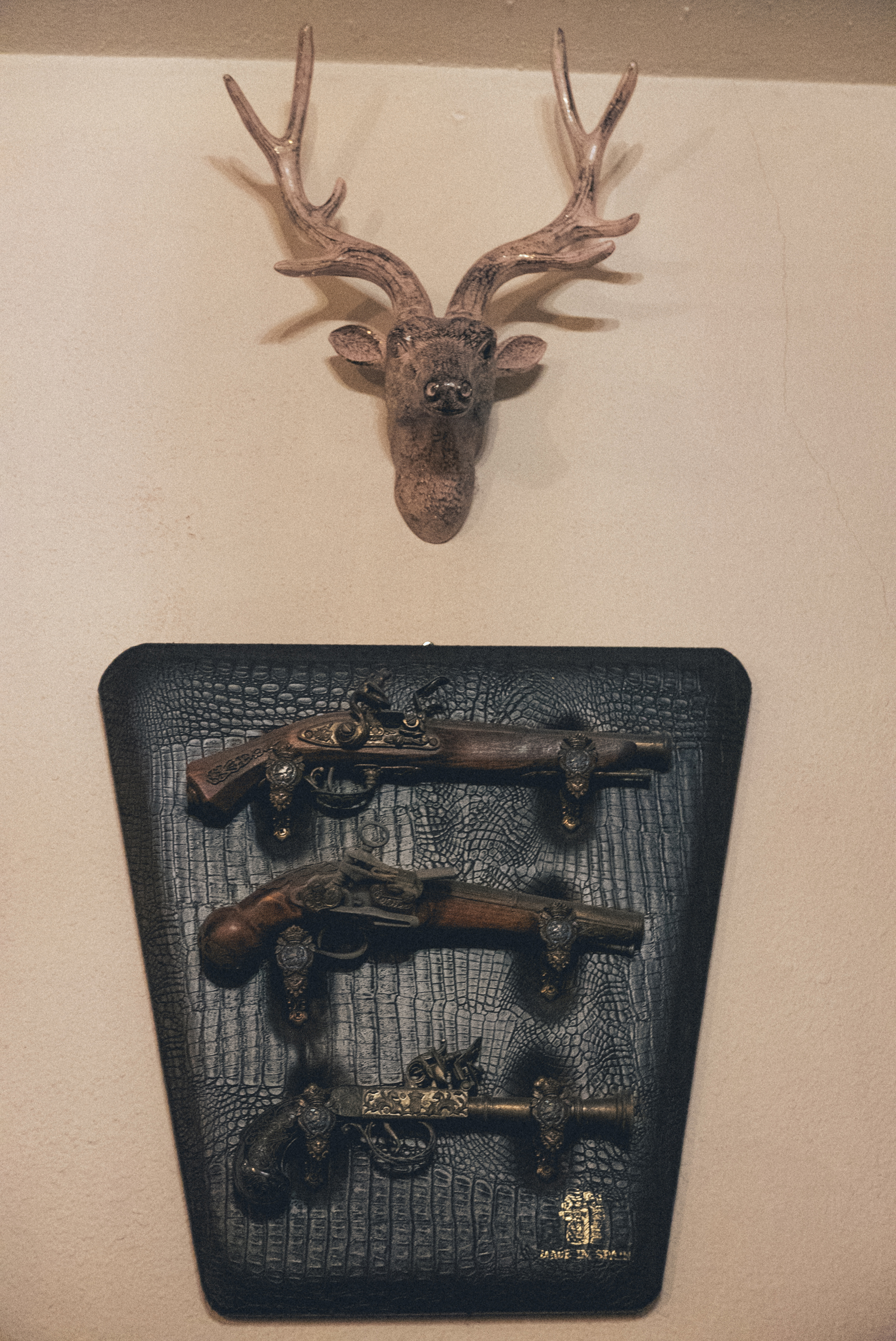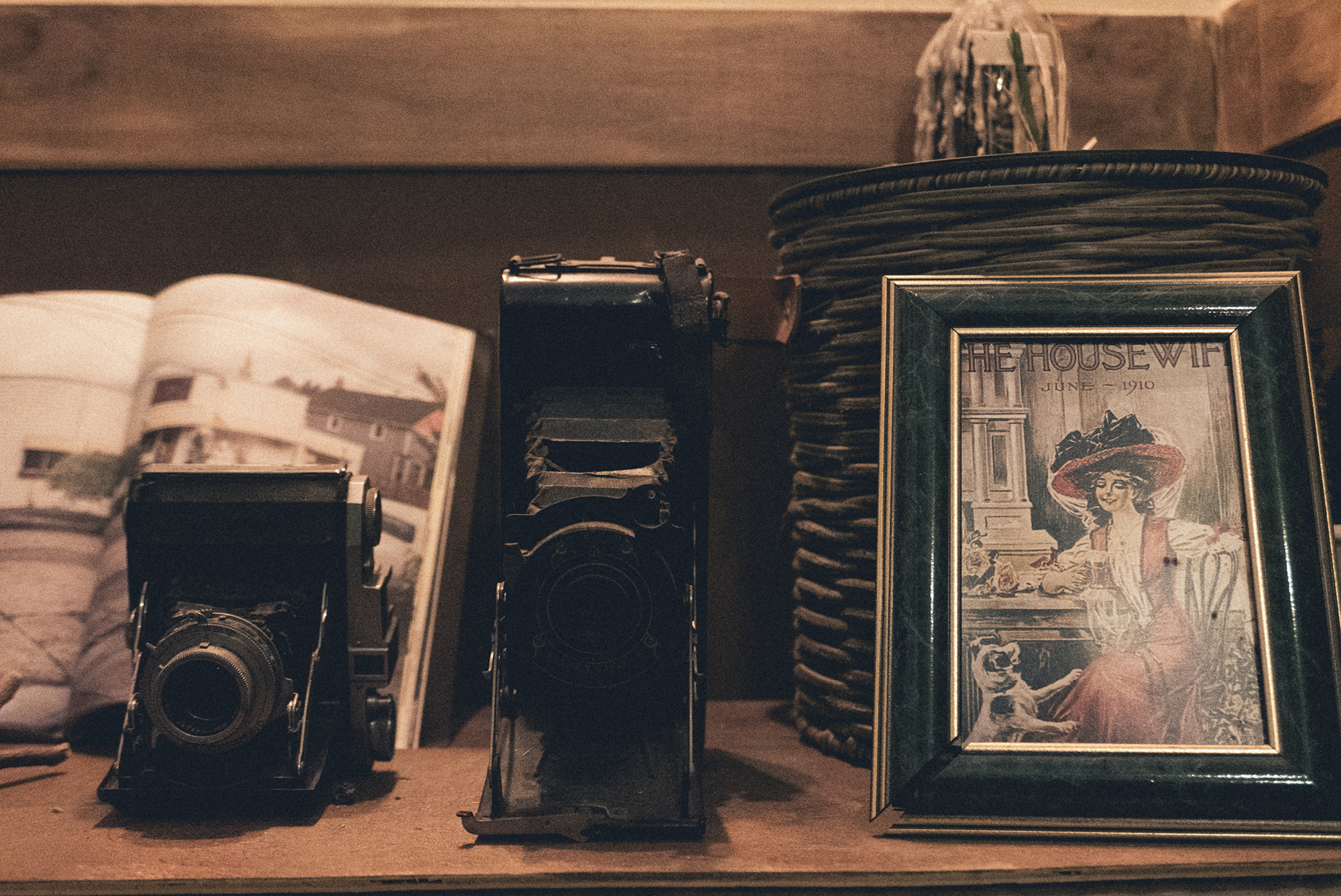 별장에 놀러 온 듯한 분위기를 연출하기 위해 정말 다양한 소품들이 마련되어있습니다. 옛날에나 사용하던 빈티지 카메라 같은 소품들, 턴테이블과 조명이며, 벽에 박제된 사슴 머리와 총까지.. 넓지는 않지만 집중적인 인테리어가 잘 되어있어 볼거리가 다양하게 있습니다. 이렇게 다양한 소품들을 구경하면서 시간을 보내기에도 참 좋습니다.