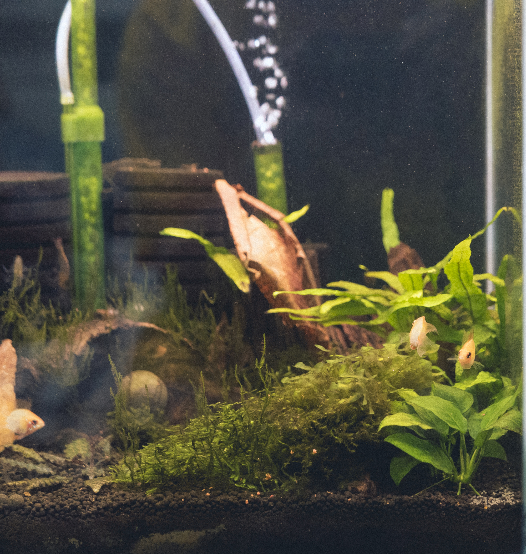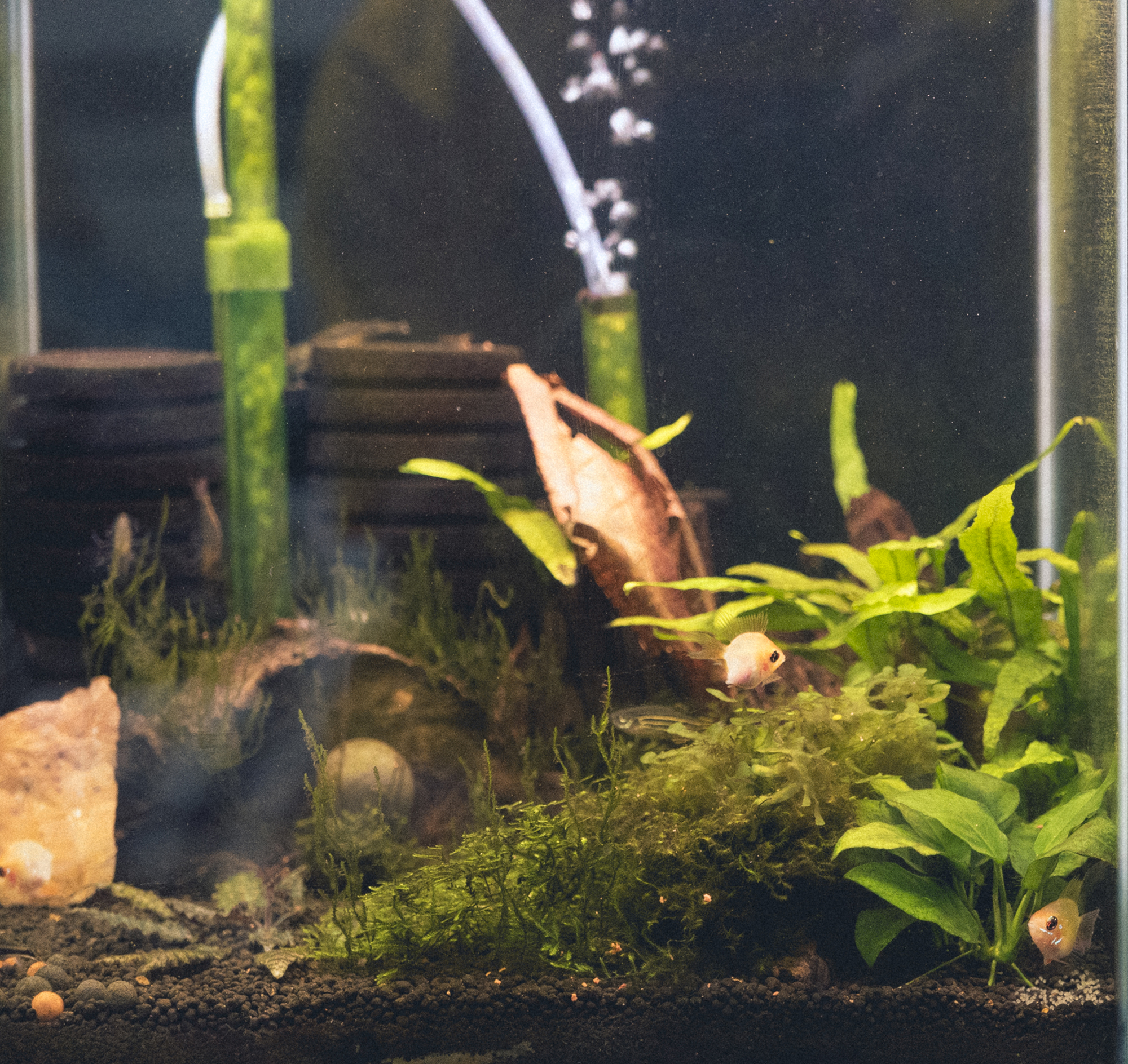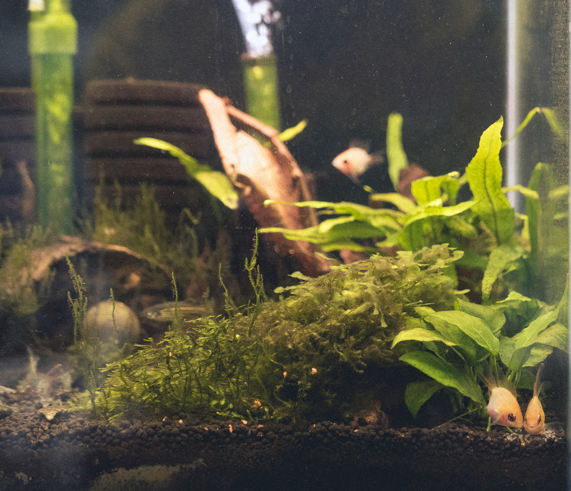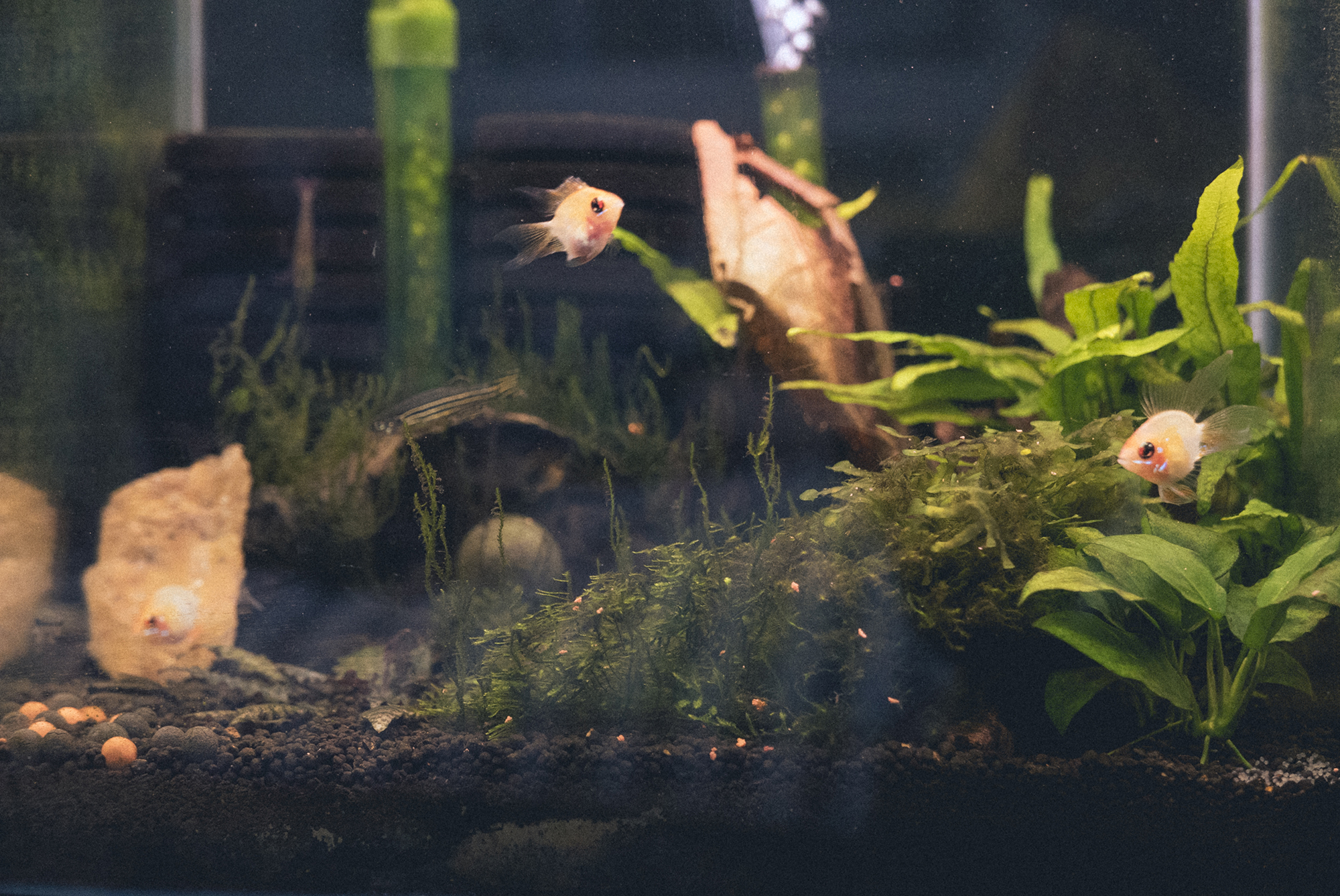 얼마 전 찾아온 골라미 롱핀들... 나나 밑에 숨어있기를 좋아하던 아이들이었는데 골라미 암컷 산란관이 나온 것 같아 사진을 찍다 보니 우측 아래에 알이 가득 발라져 있었어요! 골라미를 키워 본 지 오래됐지만 처음 보는 알 소식에 한참을 바라보다 사진 찍어뒀어요! 아직 몸통이 100원 정도의 작은 크기라서 아직 멀었을지 알았는데 생각지도 못하게 알을 보니 반갑네요.