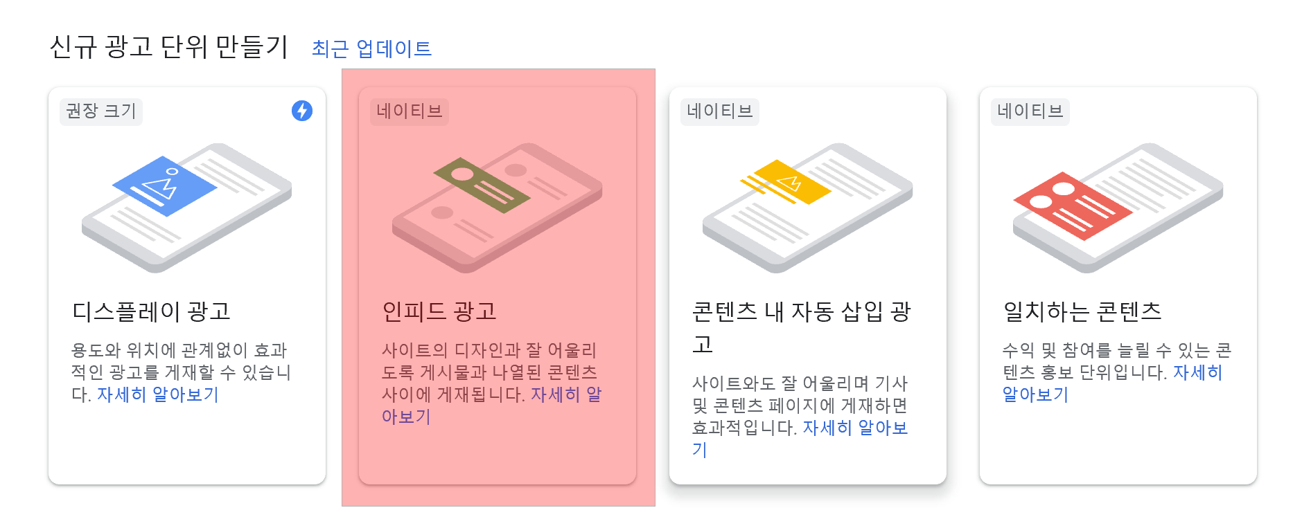 디스플레이 광고를 삽입해도 상관없지만, 목록이 부자연스러워질 수도 있고 어울리지 않아 지저분해 보일 수 있기 때문에 인피드 광고라는 항목을 하나 더 생성하여 자연스러운 목록을 보여줄 수 있습니다.